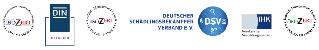 - Zertifiziert nach DIN EN ISO 9001 / 2015 (Nr. 202644), Geltungsbereich: Desinfektion & Schädlingsbekämpfung